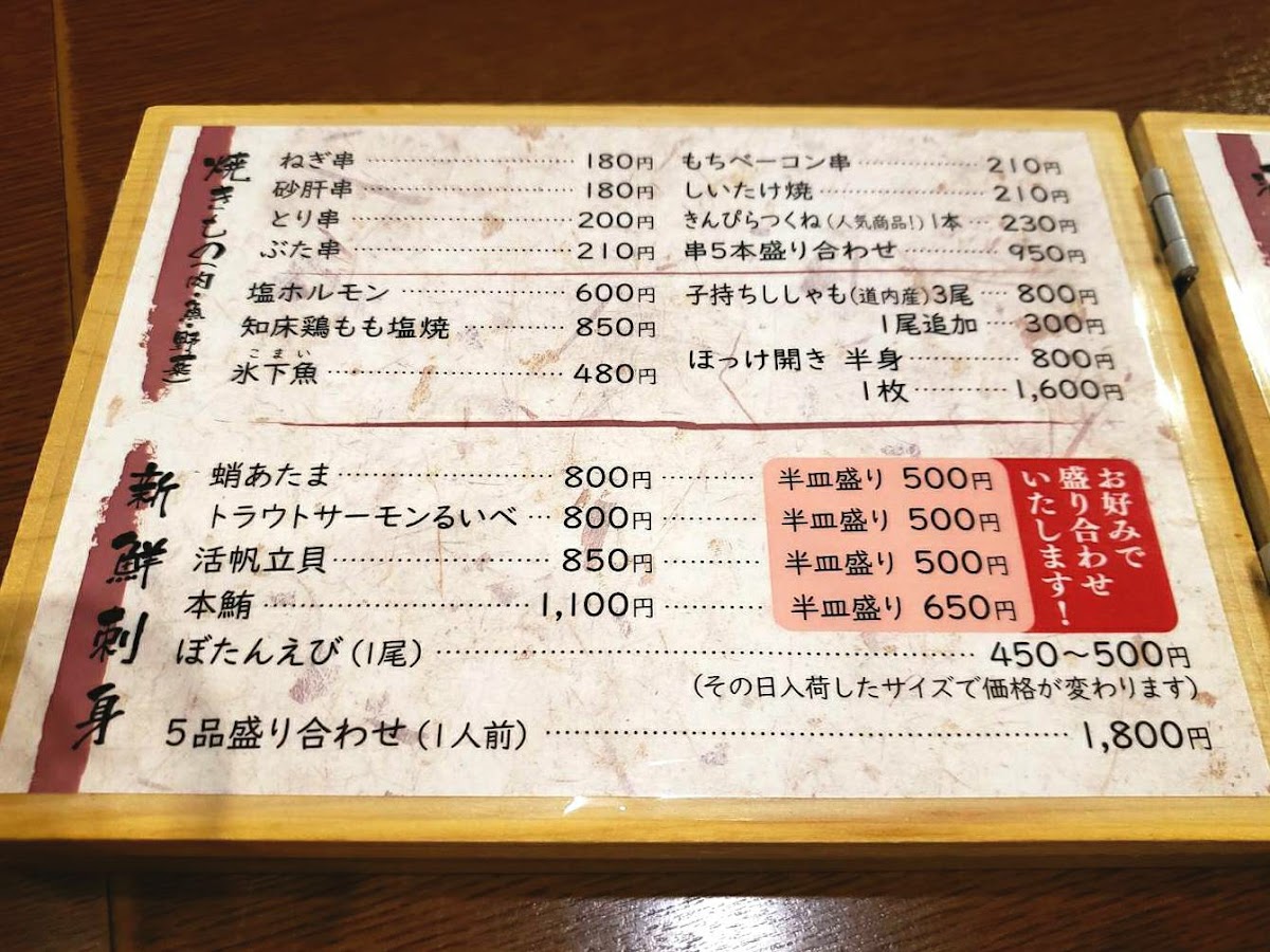 Seafood lovers will find the ぼたんえび, ホタテハーフ, and たこ頭ハーフ to be an excellent combination of sweet shrimp, scallops, and tender octopus heads, each offering its own distinct flavor profile. For something lighter, the 前菜 offers a variety of small dishes that give diners a taste of different textures and flavors.